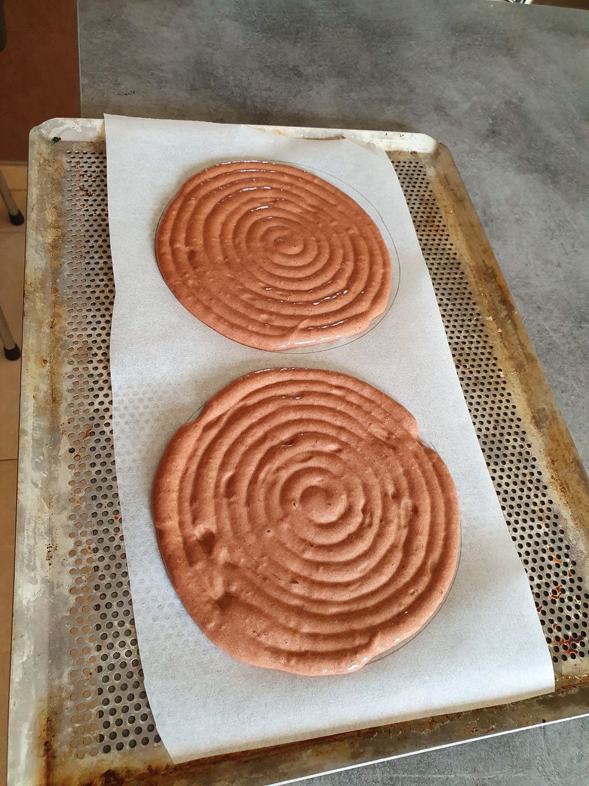 Tracez sur une feuille de papier cuisson 2 cercles de 16 cm de diamètre. Se servir de la tranche du cercle pour tracer la cartouchière (possible de la couper en deux)