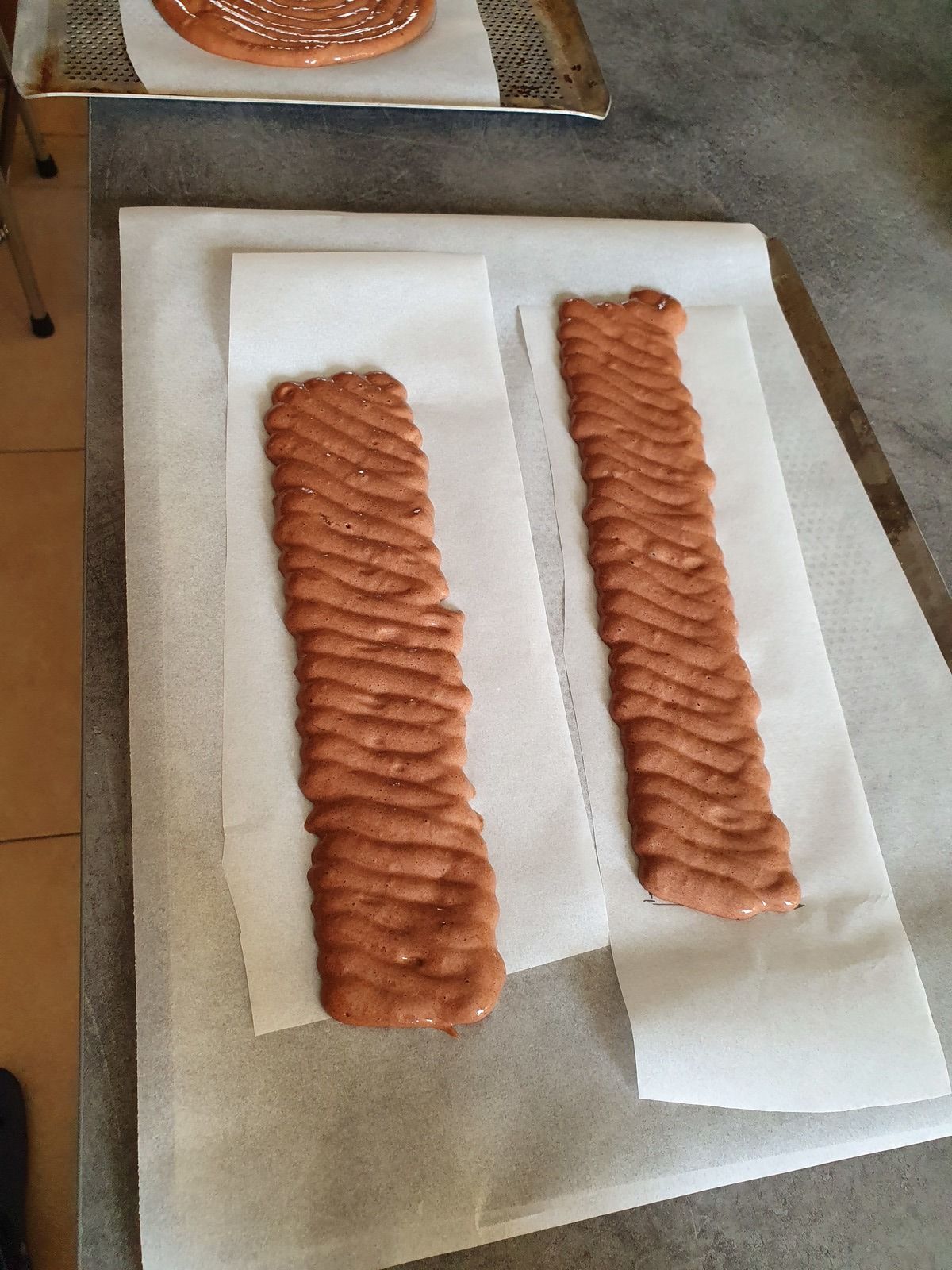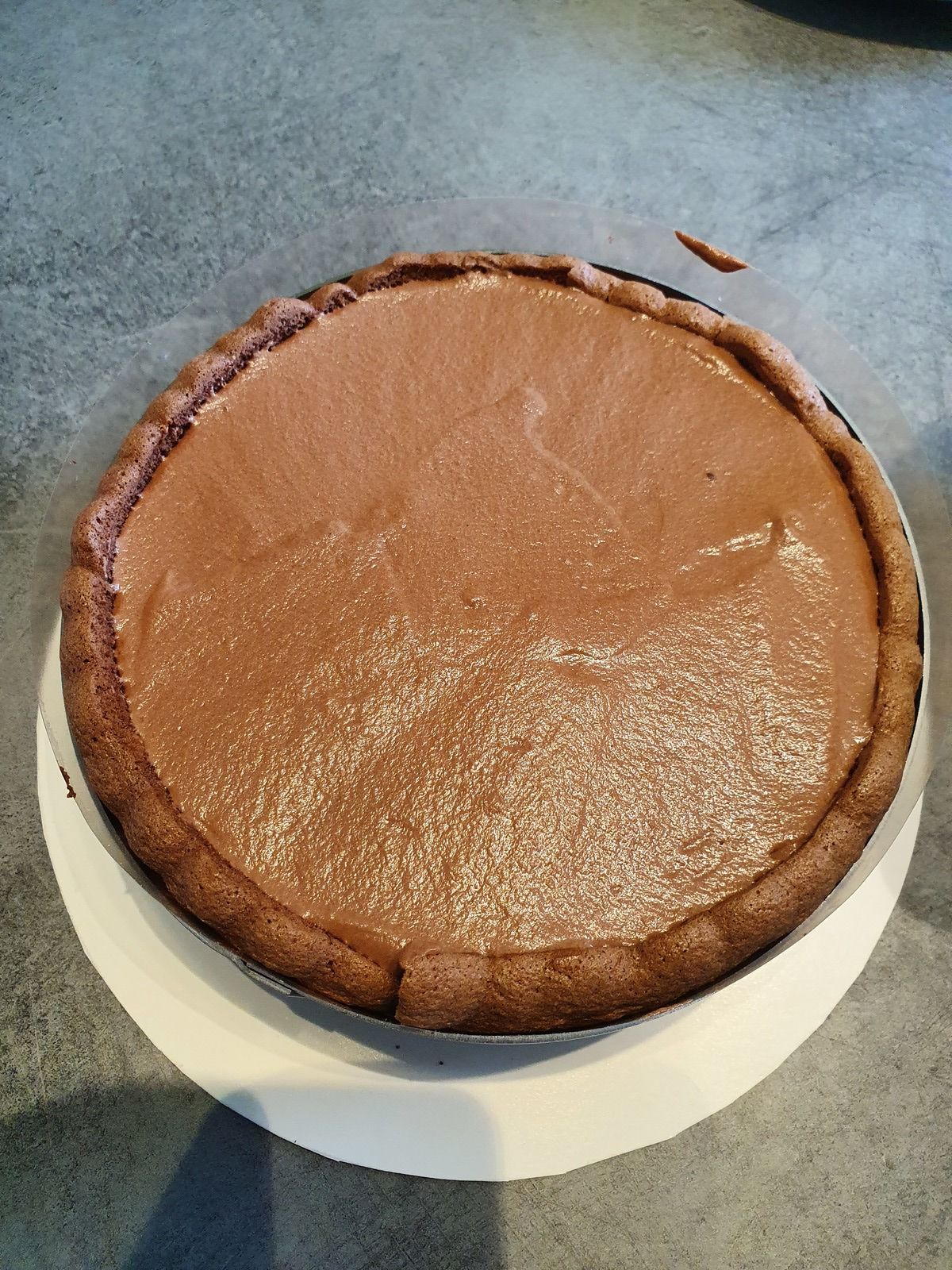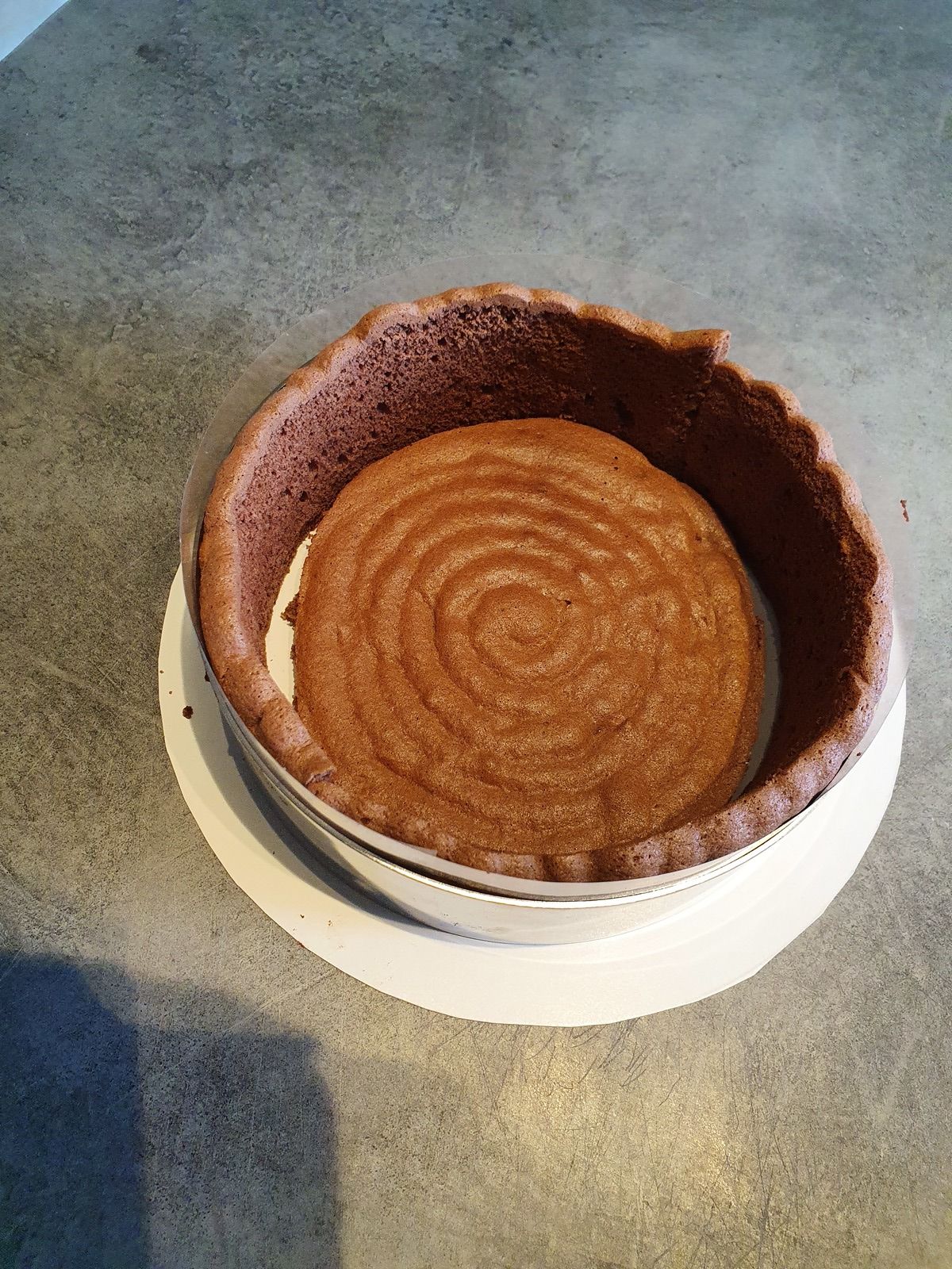 Disposez votre cartouchière sur le tour en ajustant les longueurs si nécessaire. Déposez votre premier cercle au fond (là aussi en ajustant), puis pochez une première couche de mousse au chocolat. Déposez votre second cercle et recommencez l'opération. Lissez la surface et réservez au congélateur.