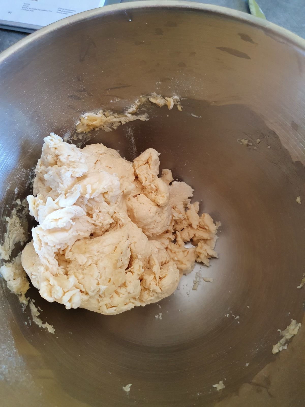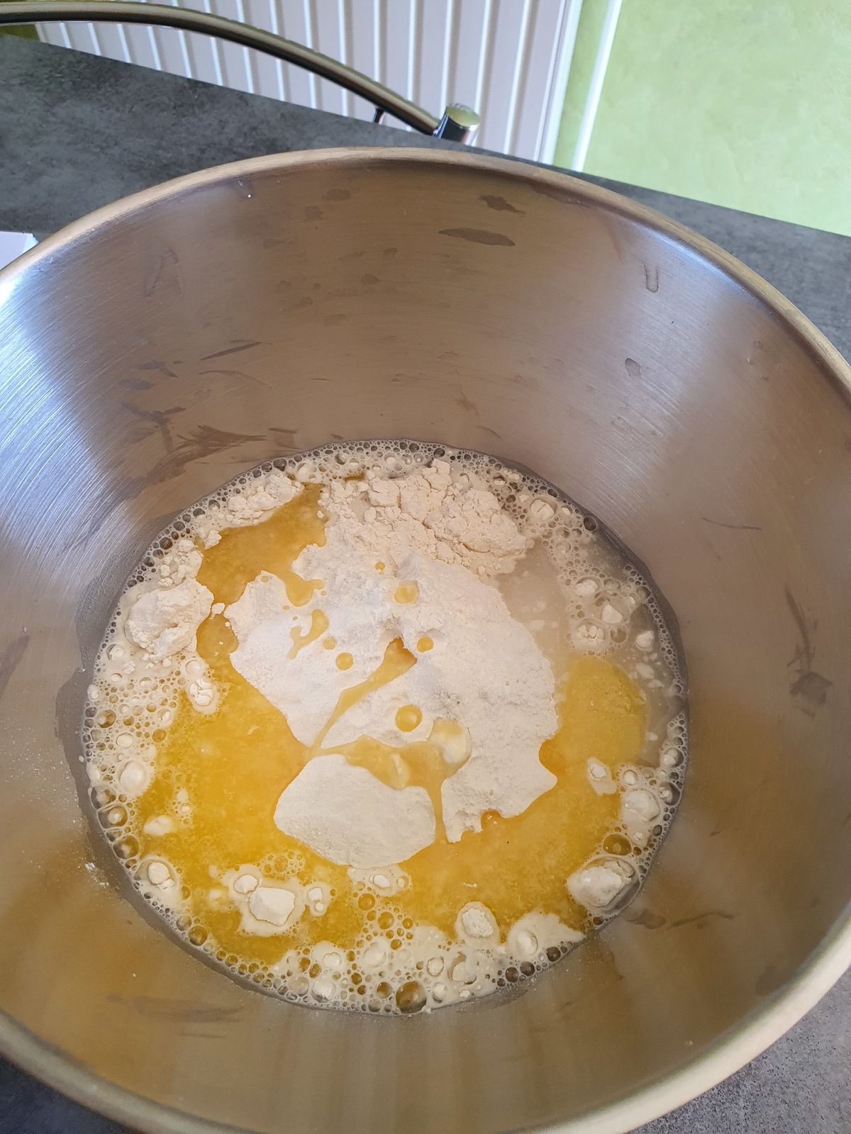 Versez la farine, l’eau, le sel et le beurre fondu refroidi dans la cuve du batteur. Mélangez à l’aide du crochet jusqu’à ce que la pâte forme une boule.