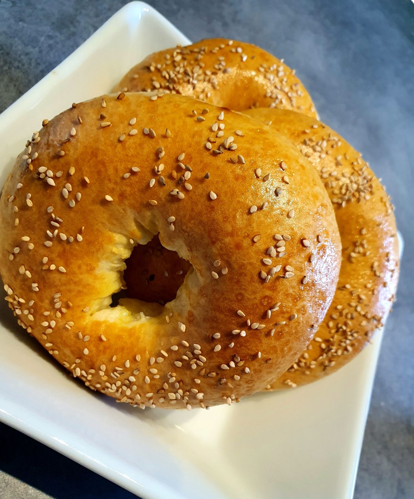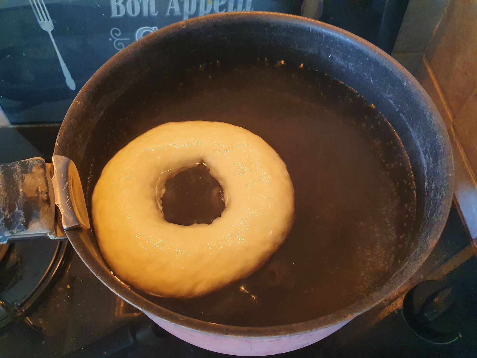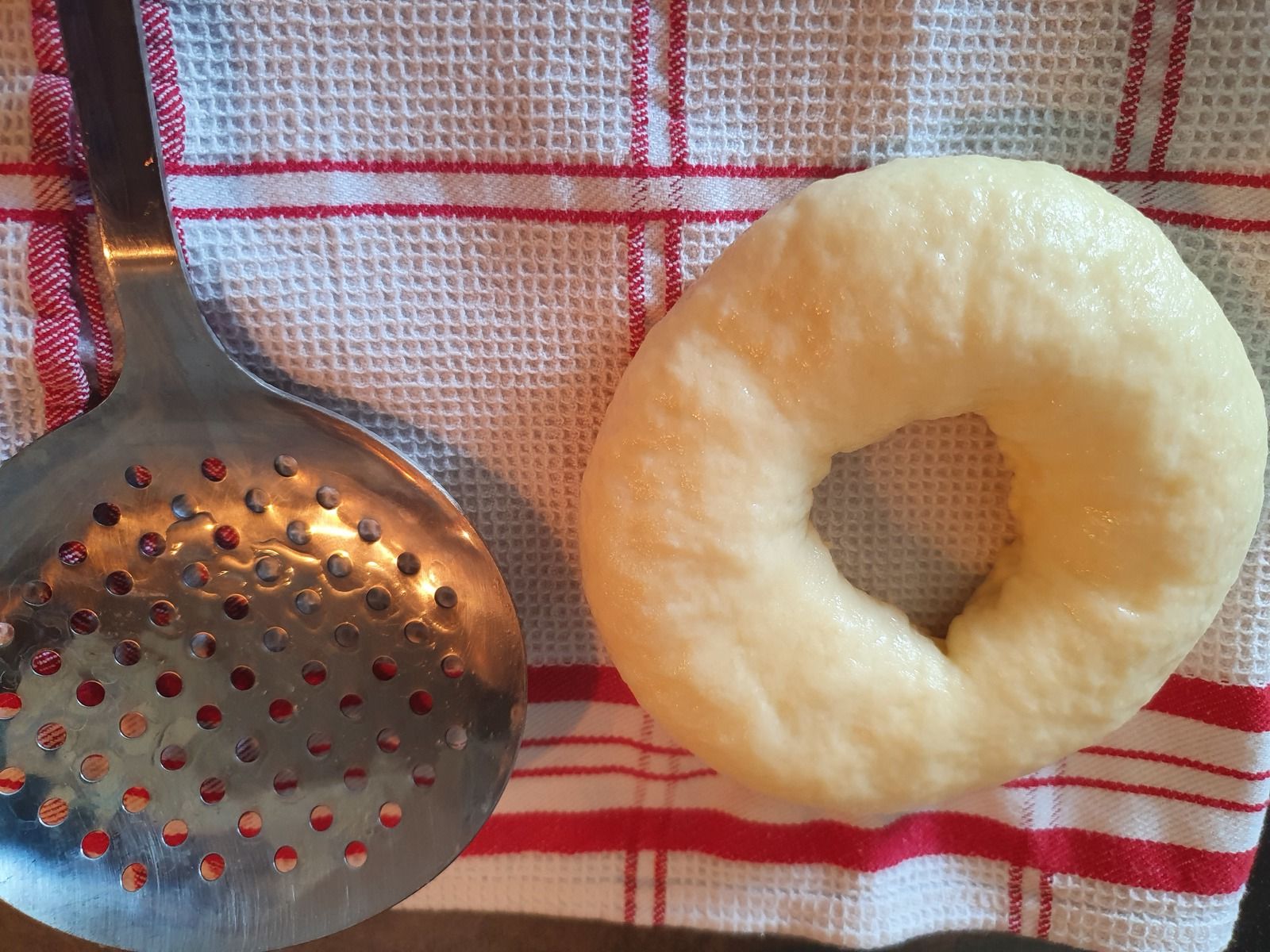 Pendant que les bagels lèvent, faites chauffer une grande casserole d'eau salée. Pochez les bagels dans l'eau pendant une minute et égouttez les sur un torchon propre.