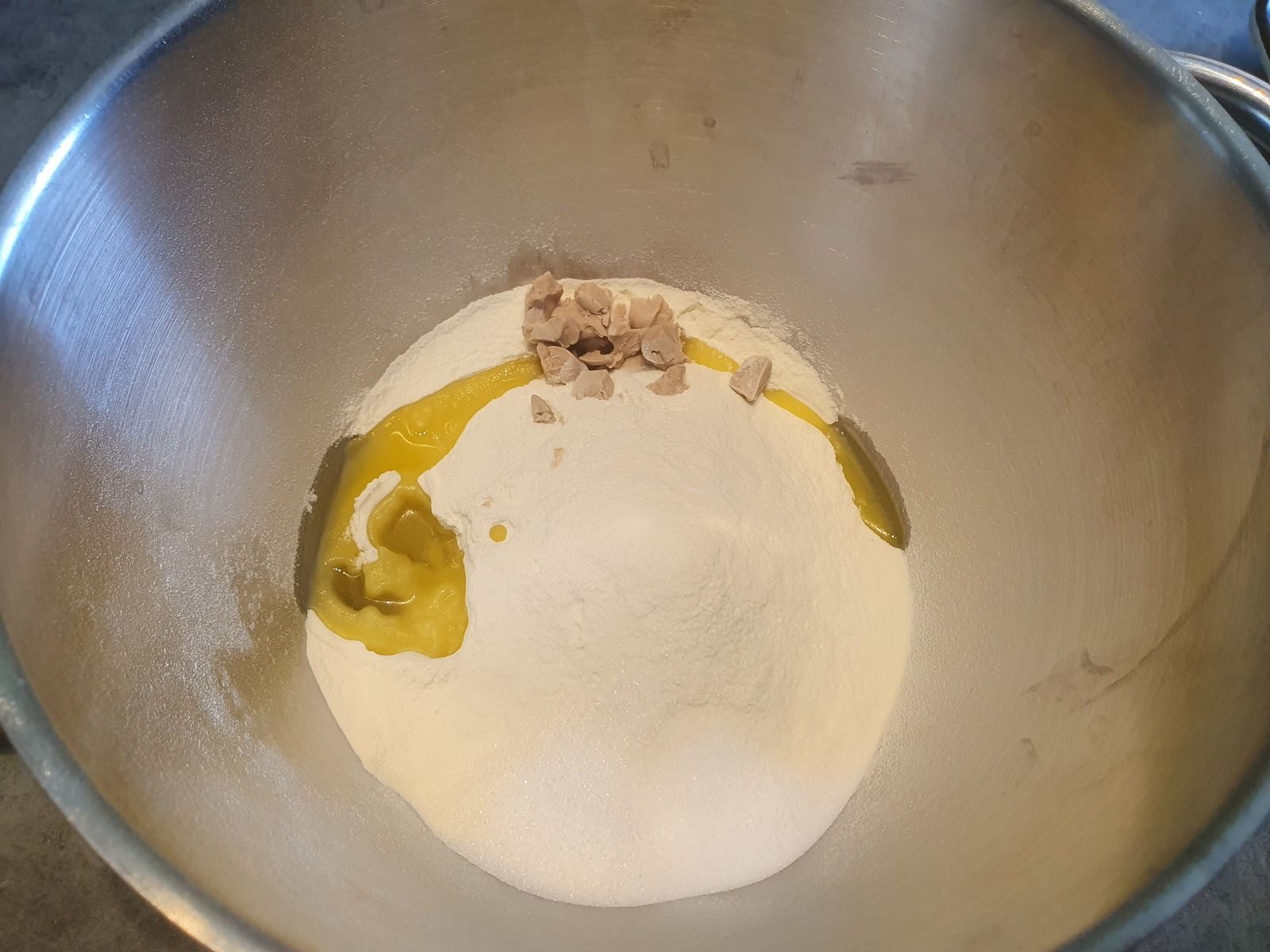 Dans la cuve du batteur, mettez la farine, l'huile, le sel le sucre et la levure. (La levure ne doit jamais être en contact direct avec le sel ou le sucre, placez la levure d'un côté et le sel et le sucre de l'autre) Ajoutez l'eau tiède. Pétrissez à l'aide du crochet pendant environ 10 minutes. Vous n'avez pas de robot ? Ce n'est pas un problème, vous pouvez faire votre mélange dans un cul de poule et pétrir à la main, ça fait les muscles !!!