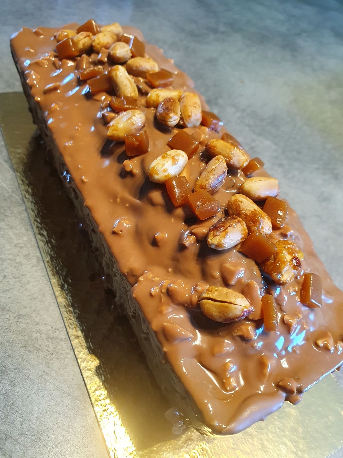 Glacez le marbré congelé, puis décorez des cacahuètes caramélisées et de petits cubes de caramel.