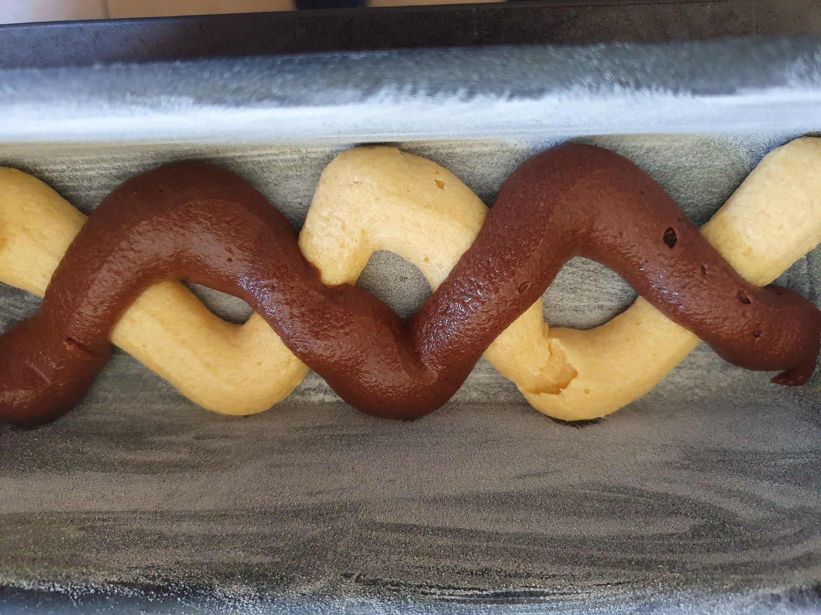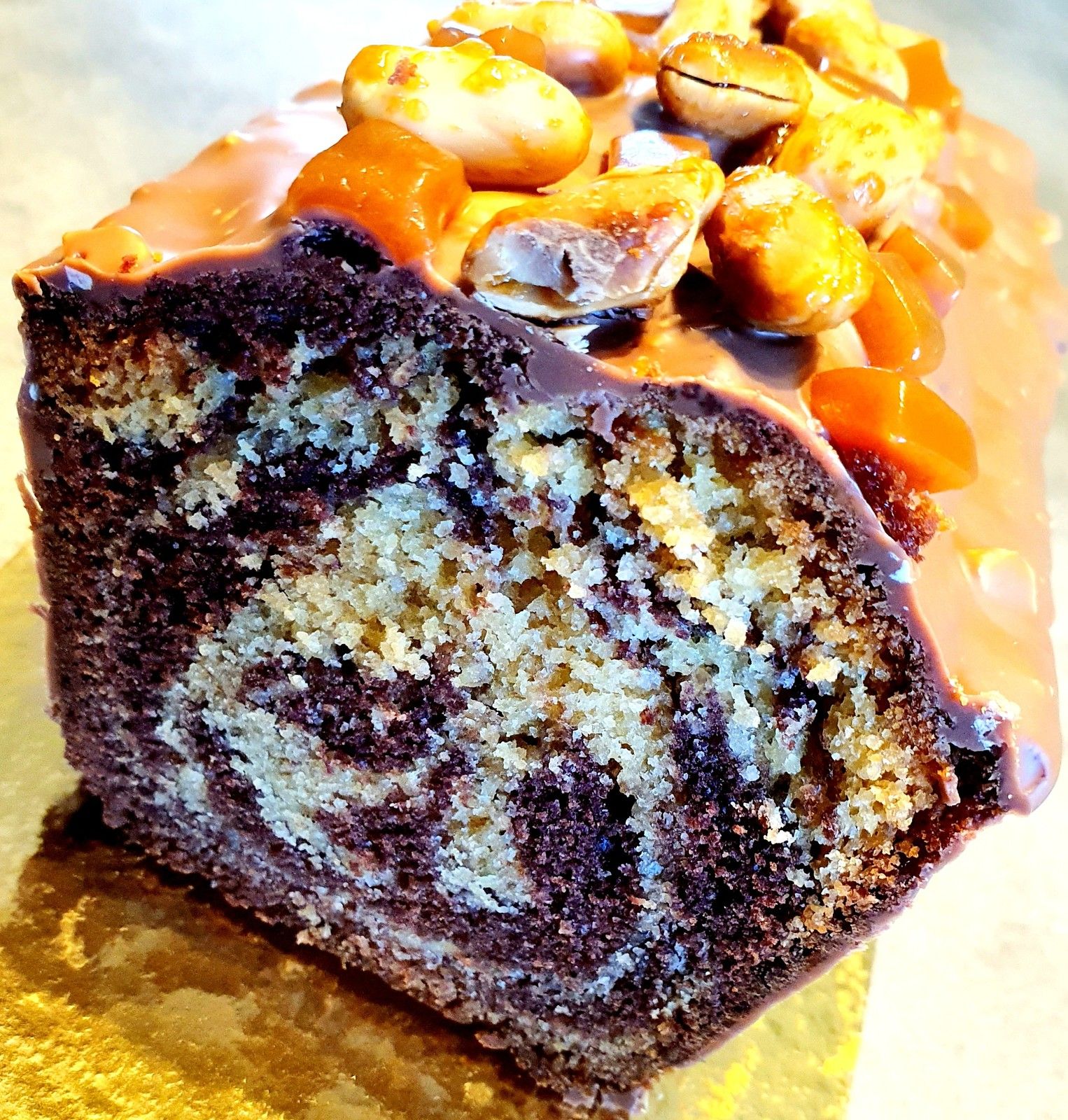 Beurrez et farinez votre moule à cake et pochez les 2 appareils pour réaliser un beau marbrage. Enfournez pour une heure et 20 minutes à 165°, surveillez la cuisson, surtout les 20 dernières minutes pour éviter que le cake ne soit trop sec.