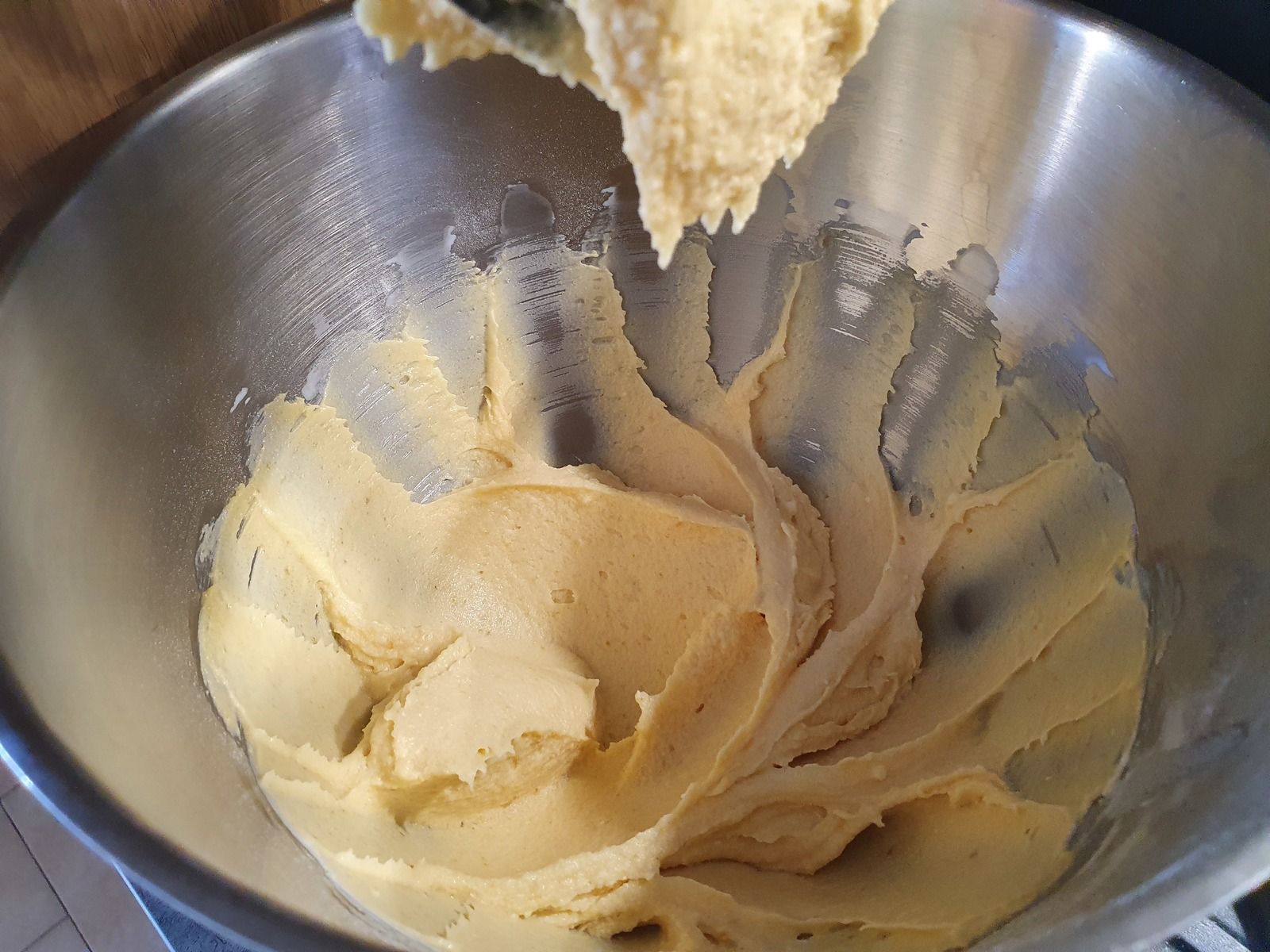 Dans la cuve du robot et à l'aide de la feuille, mélangez le beurre, le sucre, le sel et le praliné. Une fois le mélange homogène, ajoutez l'oeuf. Tamisez la farine et la levure et ajoutez les dans la cuve. Terminez par la crème. Une fois la pâte homogène, réservez dans une poche à douille (l'odeur de cette pâte est dingue !!!)