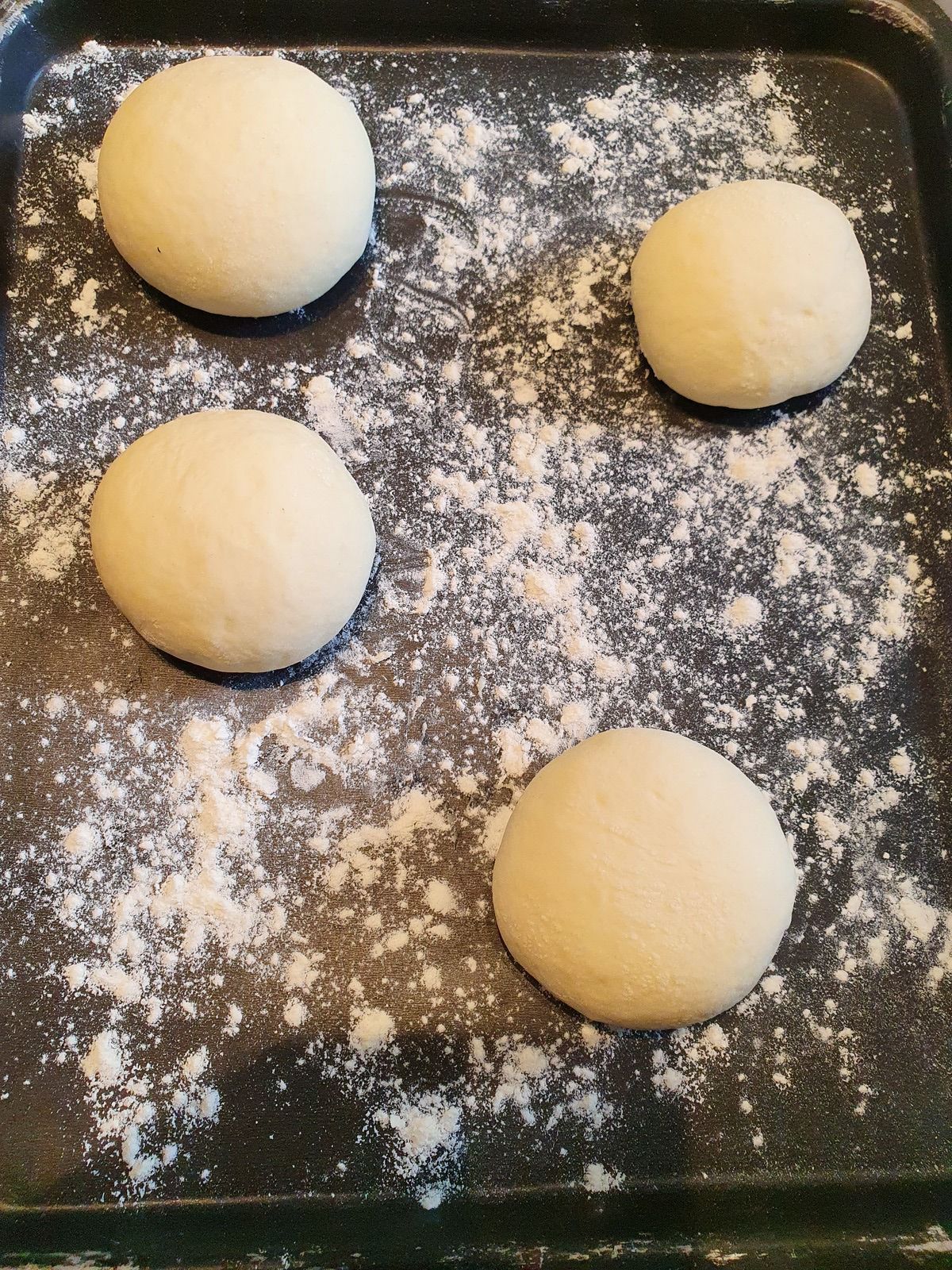 Une fois que la pâte a bien gonflé, dégazez la et formez 4 boules de taille égale. Disposez de nouveau sur une plaque et laissez pousser encore une heure comme au dessus.