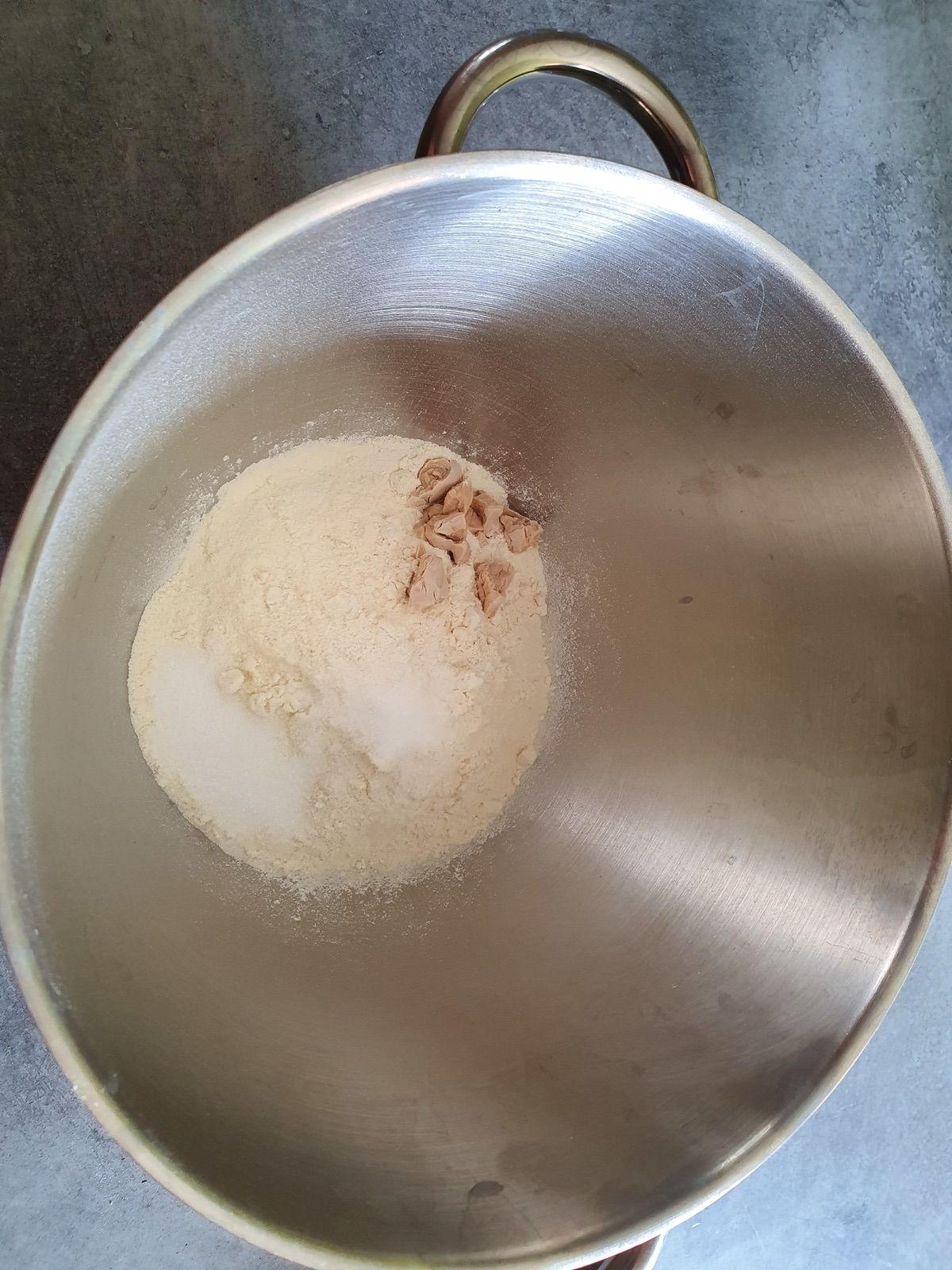Dans la cuve du batteur, versez la farine, puis le sucre et le sel d'un côté et la levure de l'autre côté. Ajoutez le beurre fondu et refroidi.