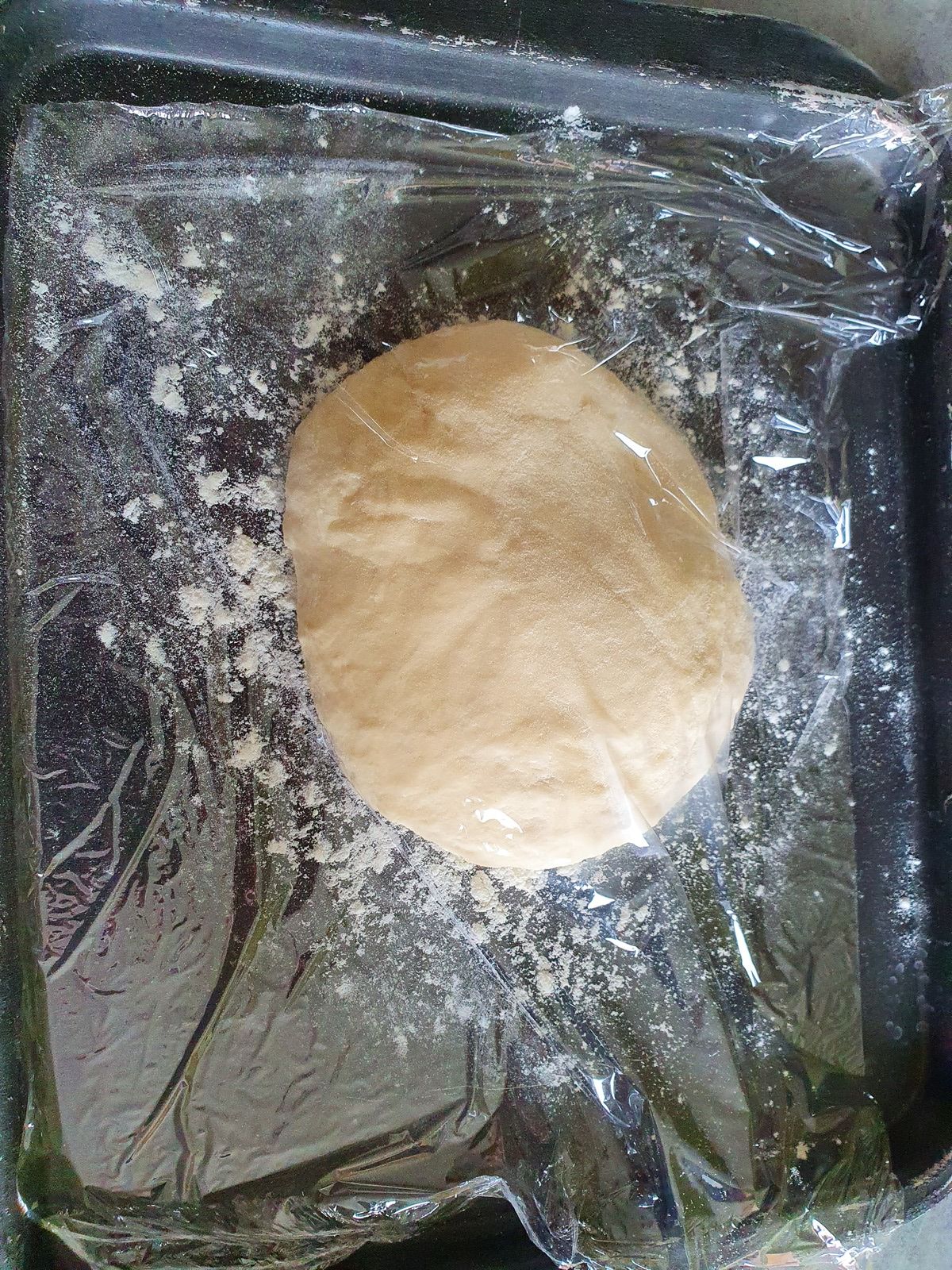 Farinez une plaque et déposez la pâte, puis recouvrez la de film alimentaire et laissez poussez pendant une heure (four éteint avec un petit verre d'eau chaude, c'est le meilleur moyen !!!)