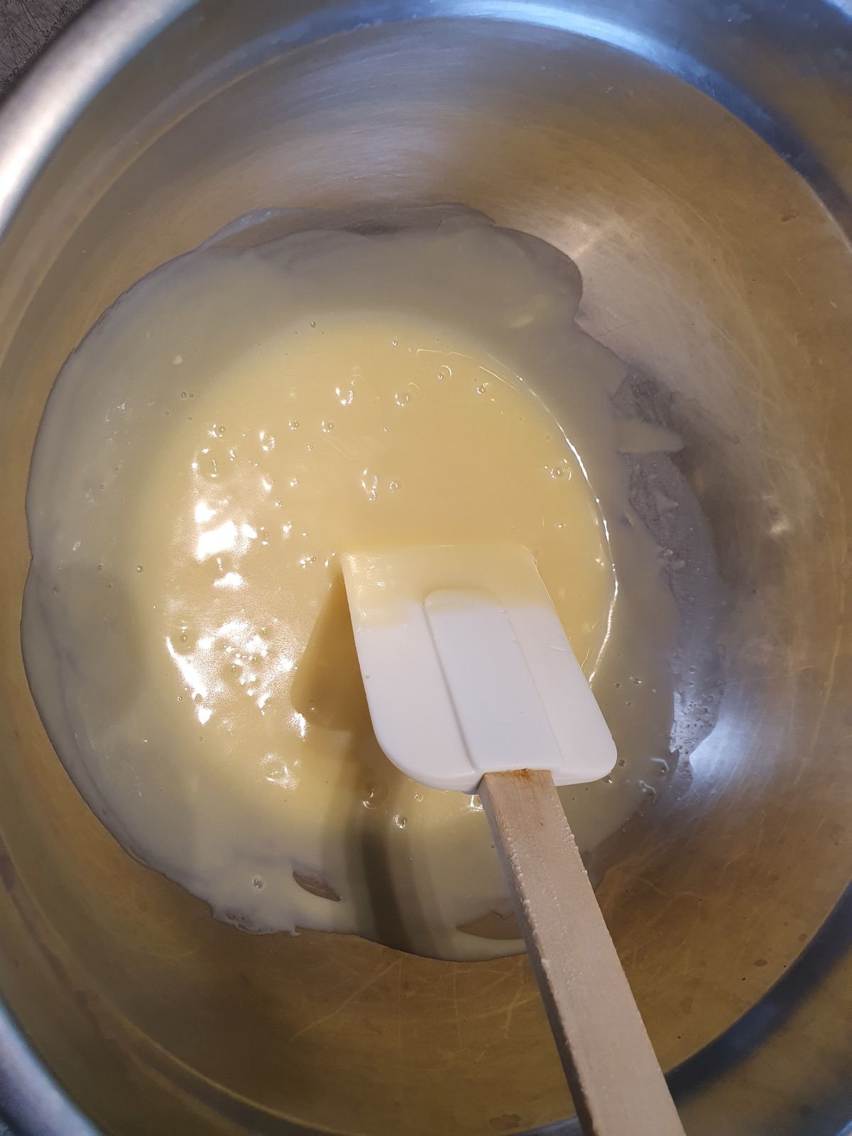 Une fois le mélange bien homogène, ajoutez 225 g de crème liquide froide et mélangez