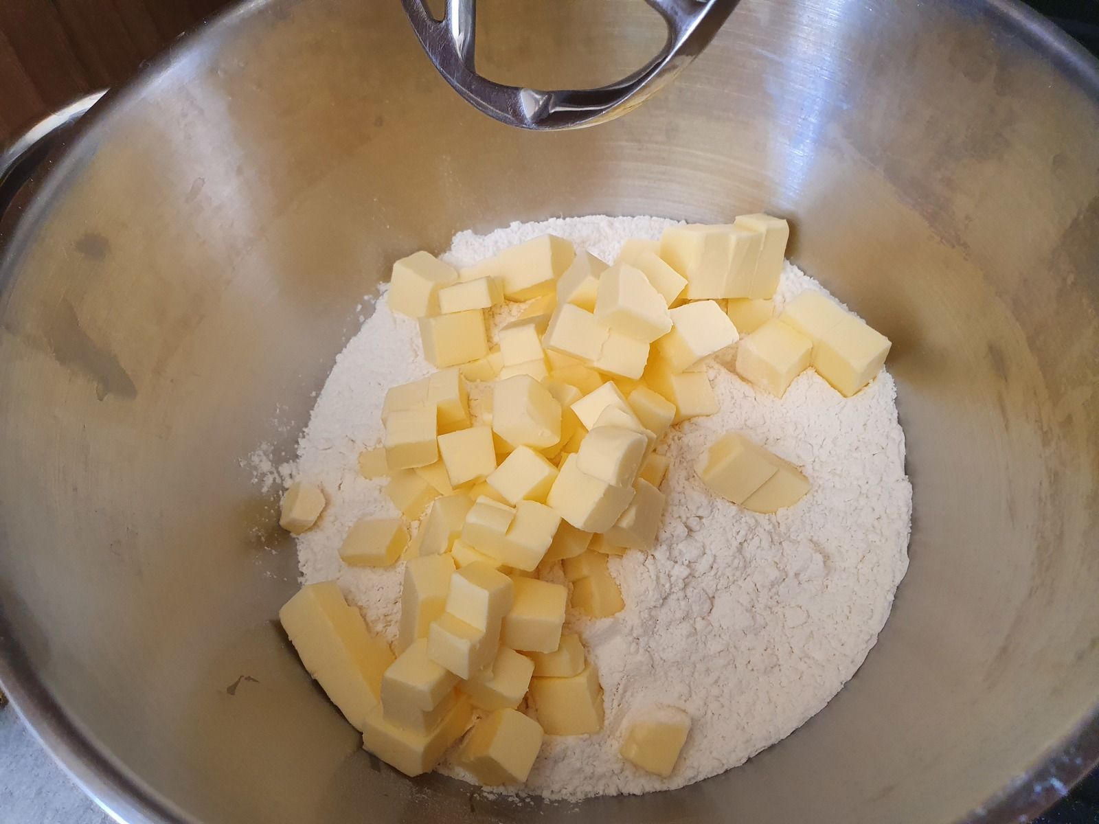 Dans la cuve du batteur, versez la farine et le beurre froid, sablez le mélange avec la feuille à petite vitesse. Il ne doit pas rester de gros morceaux de beurre, le beurre va venir enrober le grain de farine.