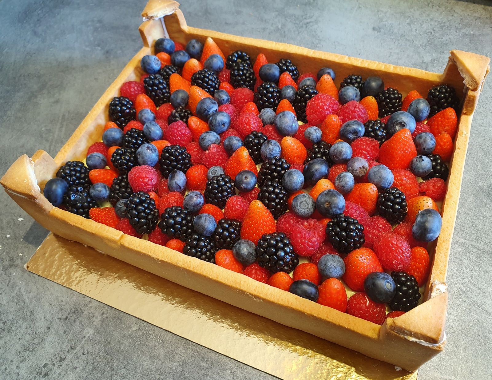 Elle se compose d'une pâte sablée, une crème d'amandes, une ganache montée à la pistache et bien sûr les fruits rouges.