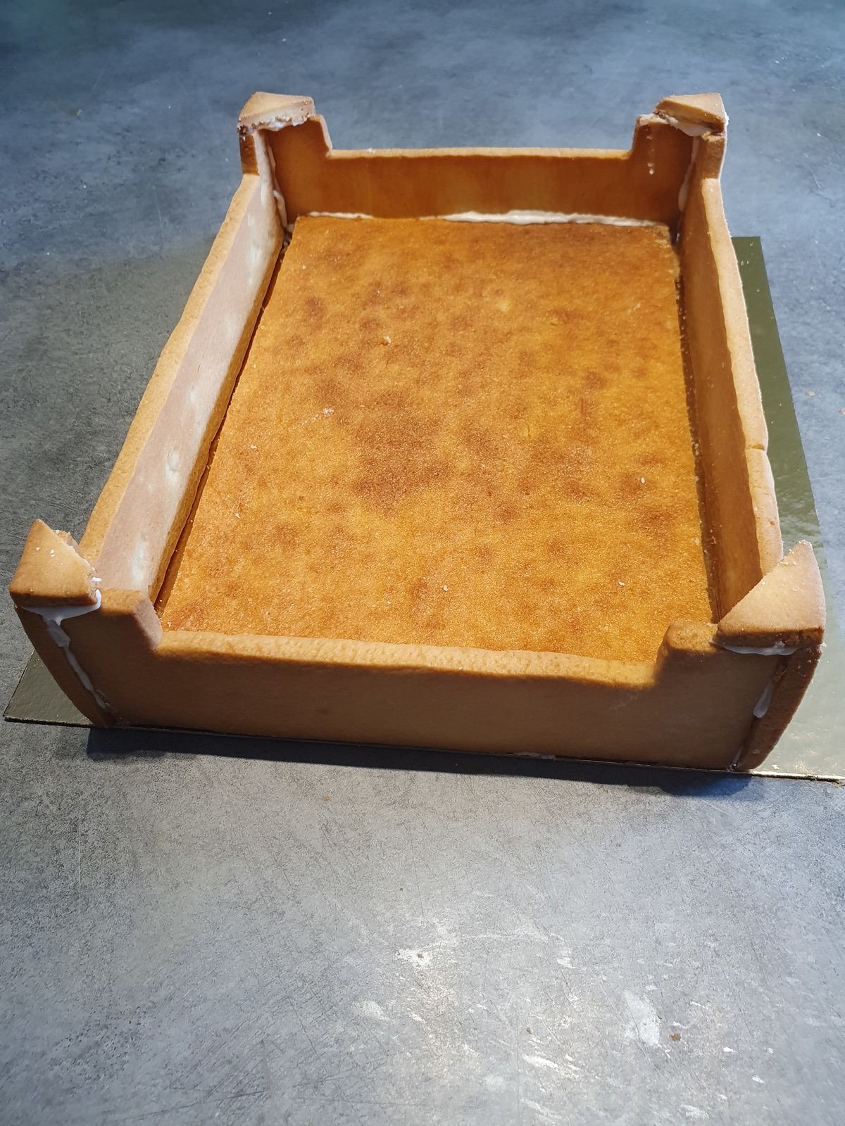 Une fois les morceaux refroidis, procédez au montage, ici j'ai utilisé de la glace royale pour le collage (sucre glace + blanc d'oeuf, texture mortier) mais vous pouvez très bien coller au caramel aussi (attention aux doigts)