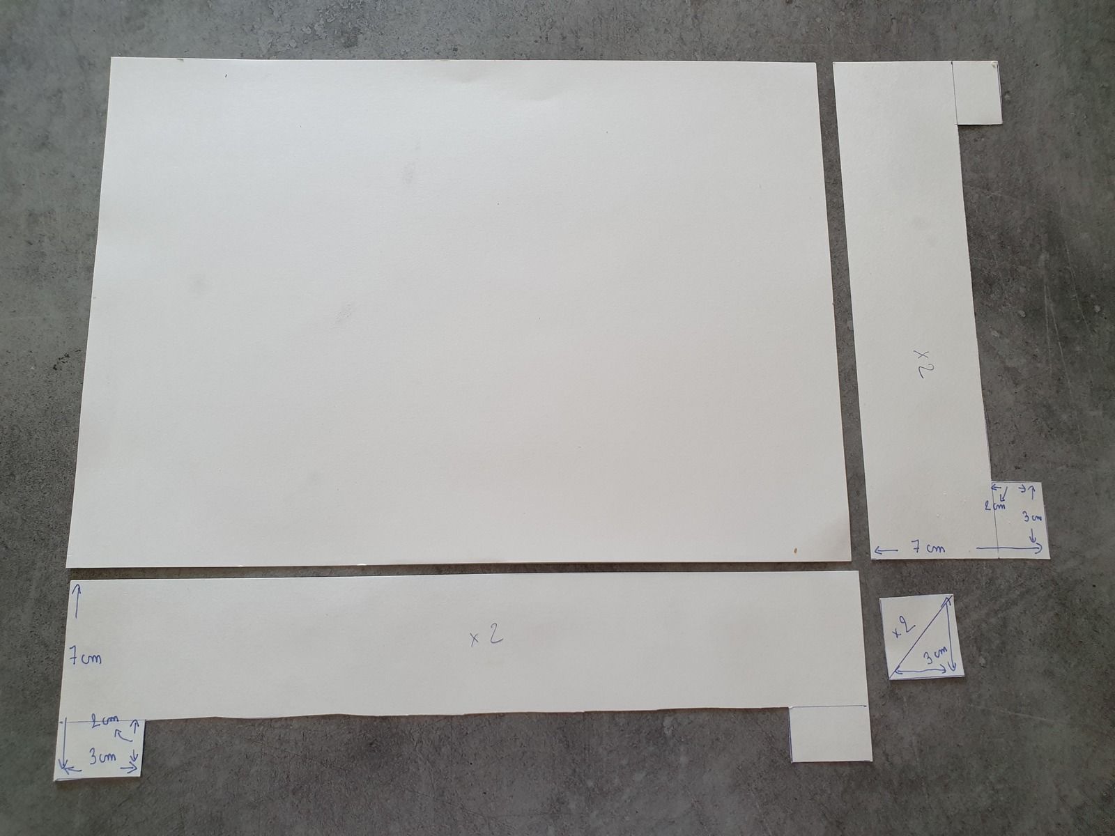 Pour le patron, j'ai utilisé une feuille A4 pour le fond de la cagette, du coup en prenant juste une seconde feuille ça a facilité les découpes pour les bords.