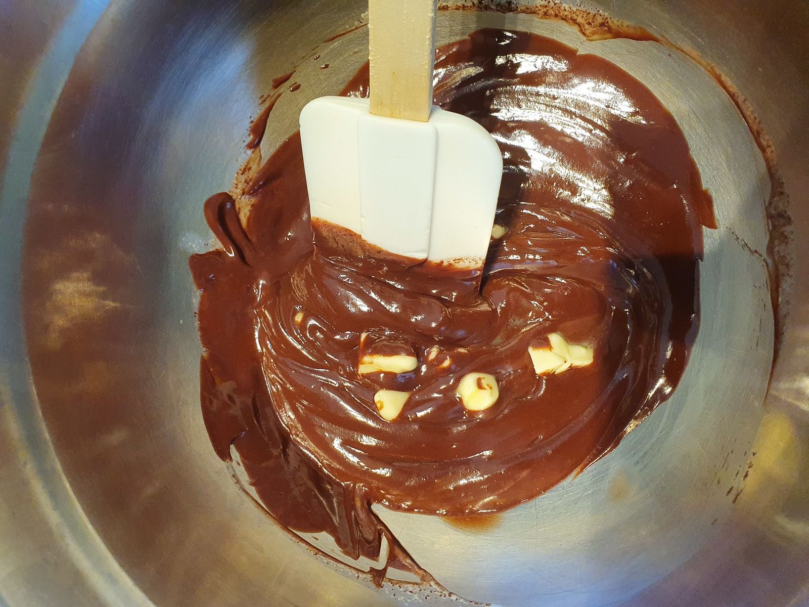 Dans une casserole, portez à ébullition la crème et le miel et versez sur le chocolat. Laissez poser une à 2 minutes (cela permet aux pistoles de chocolat de fondre) puis émulsionnez à la spatule en partant du centre de votre cul de poule. Ajoutez le beurre et lissez la préparation.