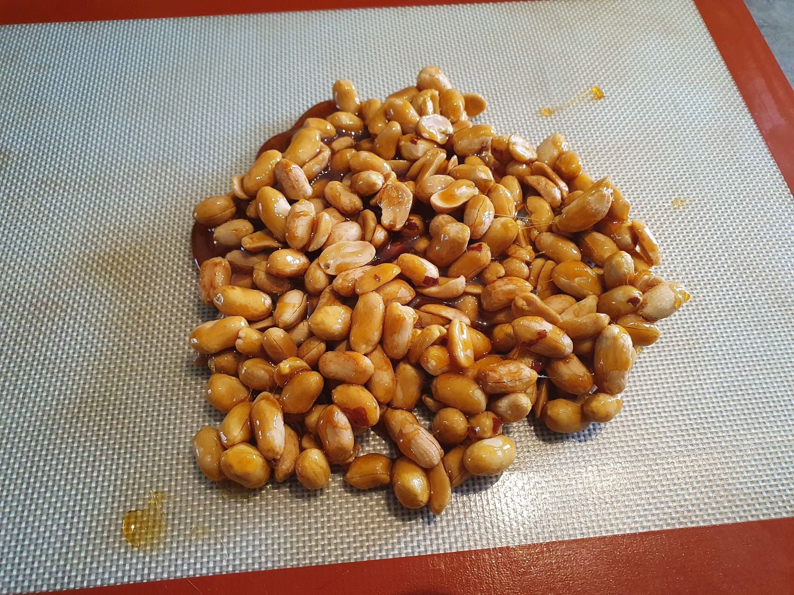 Réalisez un caramel à sec puis ajoutez les cacahuètes, réservez et laissez refroidir sur un silpat.
