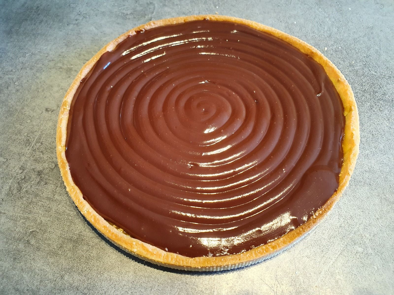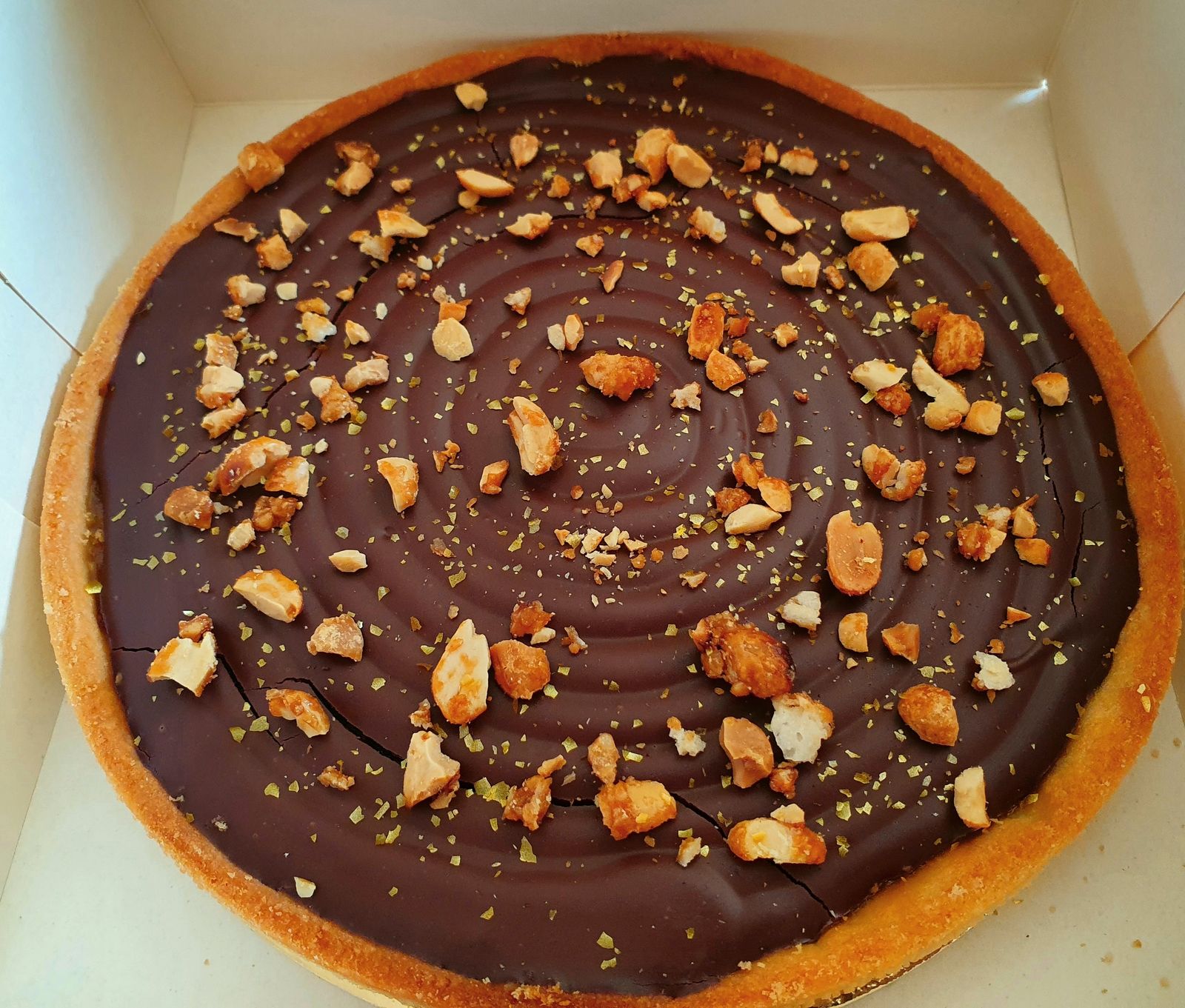 Cette tarte se compose d'une pâte sucrée, d'un crémeux au praliné de cacahuètes et d'une ganache au chocolat noir ... Délicieusement calorique !!! ![]()
