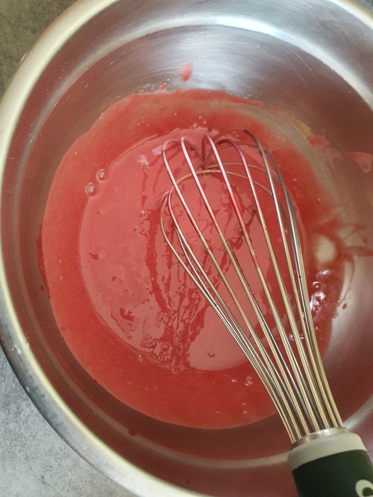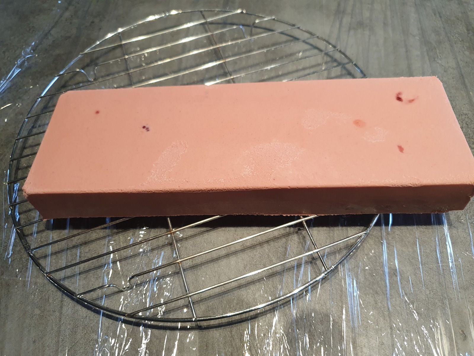 Coulez immédiatement dans votre moule, vous pouvez ajouter les framboises à ce stade. Ici, j'ai fait un montage à l'envers, j'ai donc ajouté mon biscuit juste après avoir coulé la mousse. Laissez congeler une nuit.